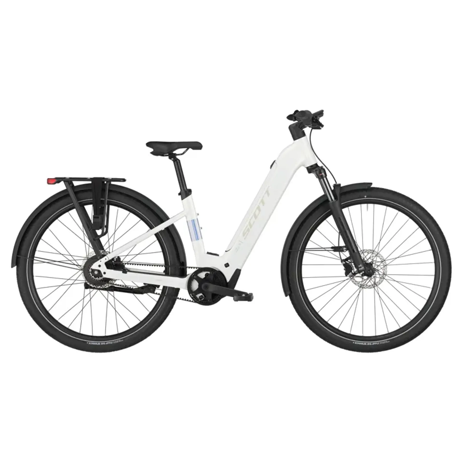 This is the all-new SCOTT SUB eRIDE: an electric urban bike powered by the all-new Bosch Performance CX motor and 800Wh battery. To minimize maintenance, the SUB features a belt-driven drivetrain, so there is no need to oil a chain anymore. You can now bring along the kids with you thanks to the new Syncros Heavy Duty rack that can carry up to 27kg.
