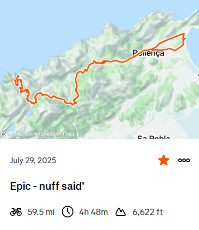 We once again headed out to Mallorca for another 4 night, 5 day cycling trip. Staying in the same hotel we were able to tackle some new climbs and new routes. Apart from a few hours one afternoon we once again enjoyed great weather, a little cooler than in 2024 and therefore perfect for cycling.